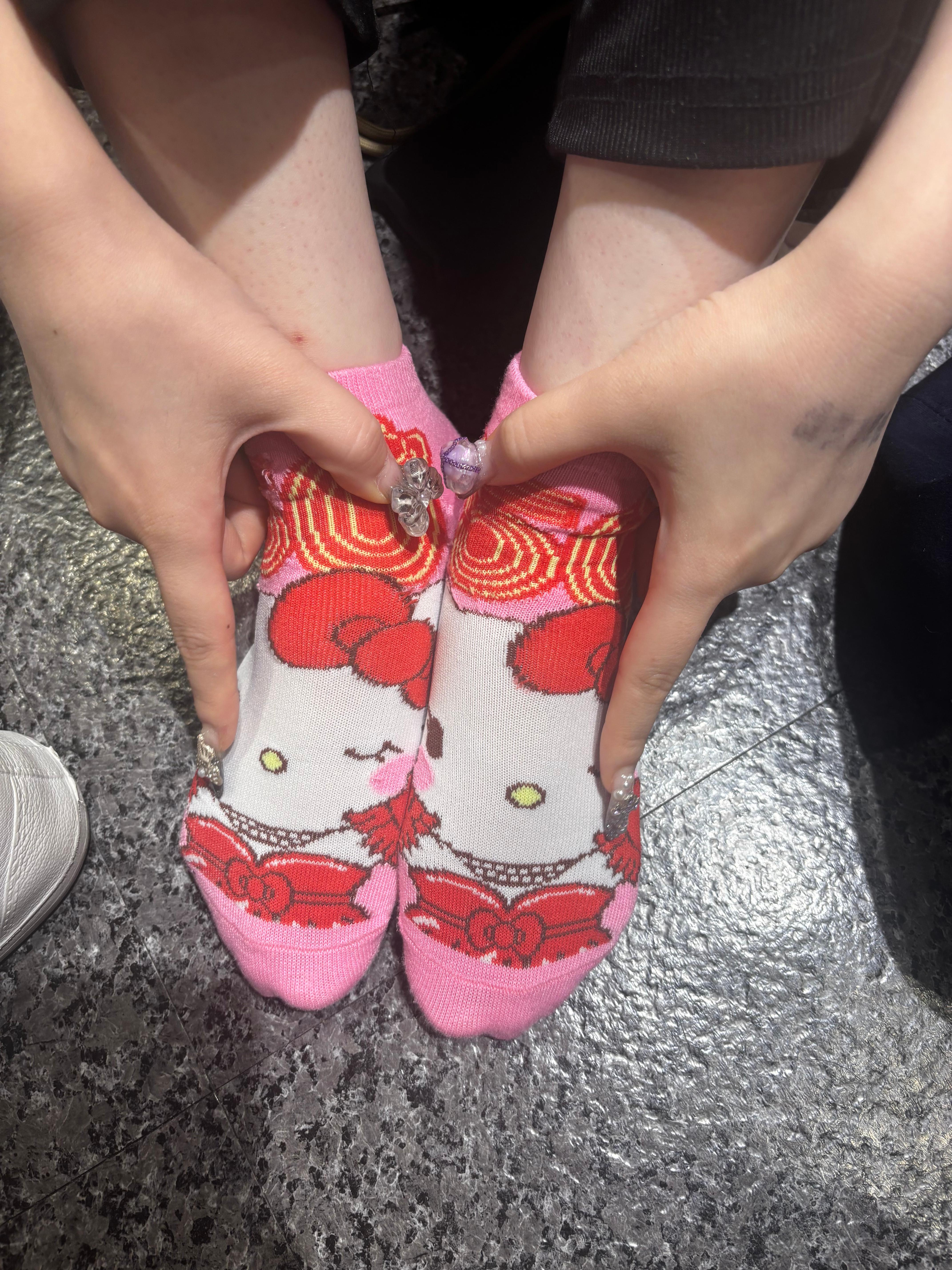 파루가 진주목걸이를 낀 헬로키티 양말을 끼고 왔는데 (아마도) 타나가 진주목걸이가 아니라 이빨같다고 파루를 놀렸음... 근데 듣고 난 뒤로 저도 계속 그렇게만 보여서 양말 사진을 찍었어요 하하 진짜 신기한 양말이었다